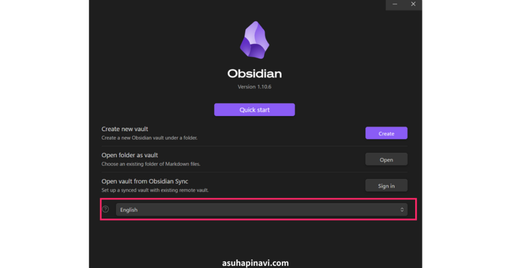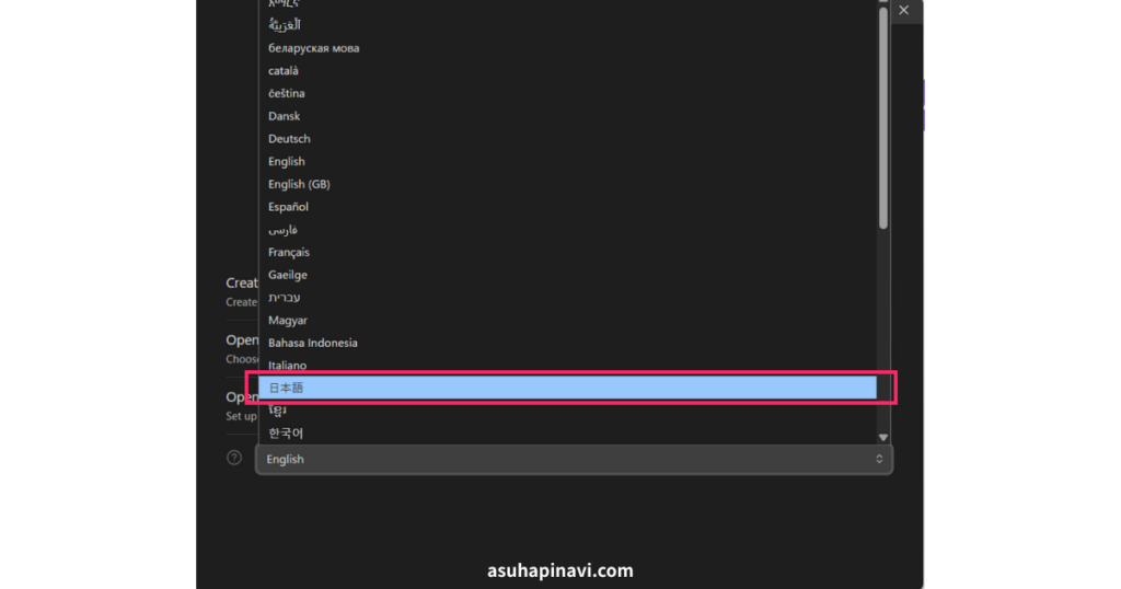 4.Obsidianの画面を立ち上げ「日本語」を選択