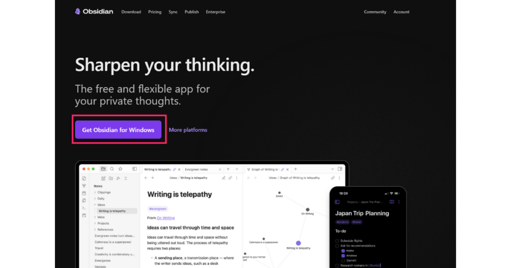 ②Windowsで使う場合、「Get Obsidian for Windows」をクリックします。