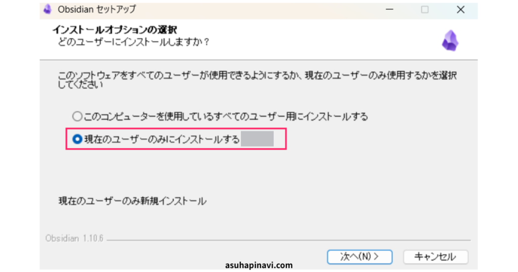 自分専用のPCを使っている人は、「現在のユーザーのみにインストールする」 を選べばOKです。