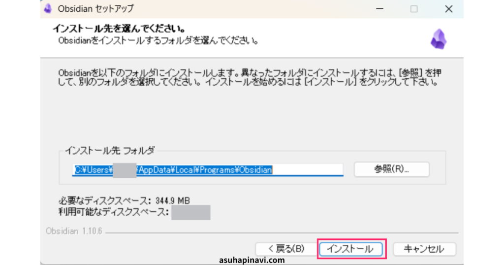 この画面では、Obsidianの「インストーラー(セットアップ用のファイル)」を一時的に保存する場所を聞かれています。